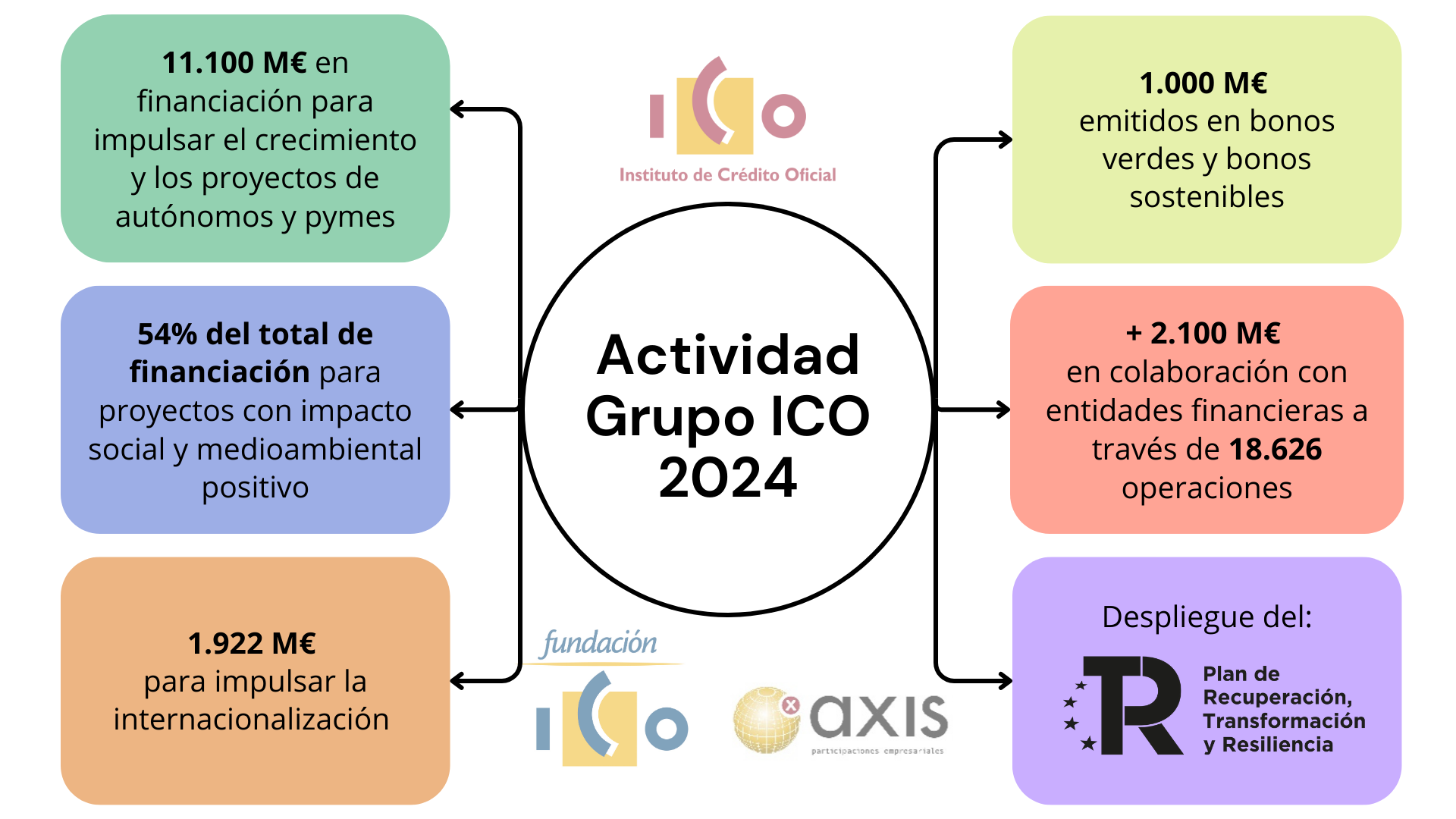 El ICO emite bonos en los mercados de capitales para llevar a cabo su actividad de financiación empresarial. En 2024 el ICO captó fondos a medio y largo plazo por importe de 11.144 millones de euros.
